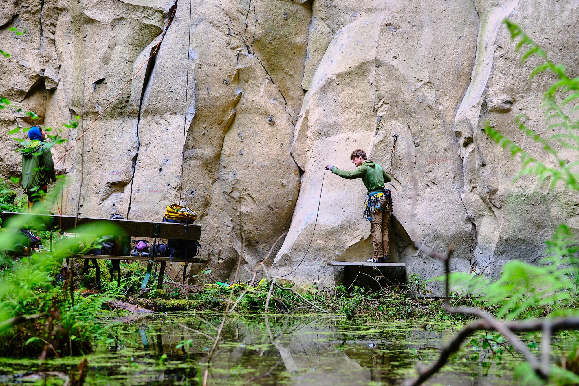 Au fond de cette carrière se trouve une petite mare où les départs de voies sont un peu... humide ?! Un peu à la manière du Tarn et du secteur de l'Oasif, les grimpeurs et grimpeuses commencent leur voie au dessus de l'eau, attention à ne pas trop mouiller la corde quand on la ravale !