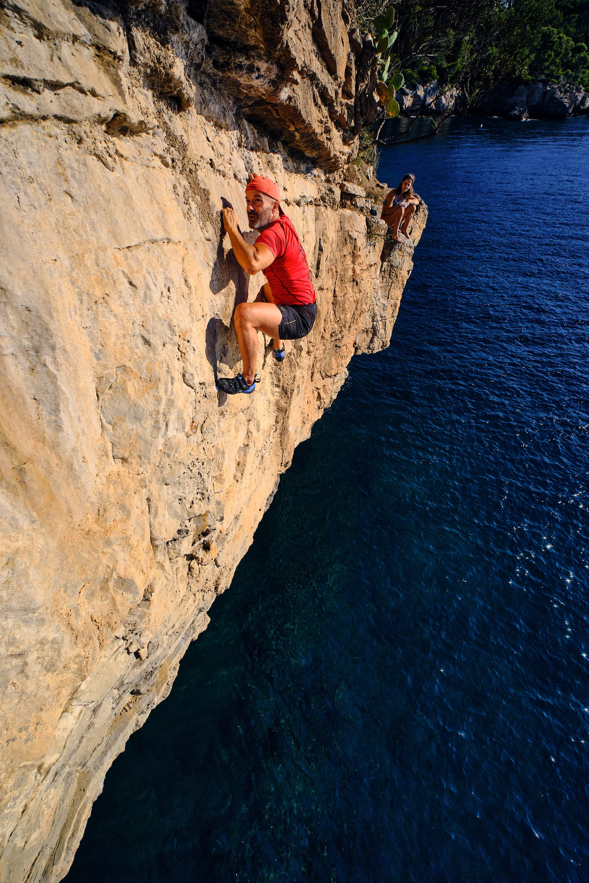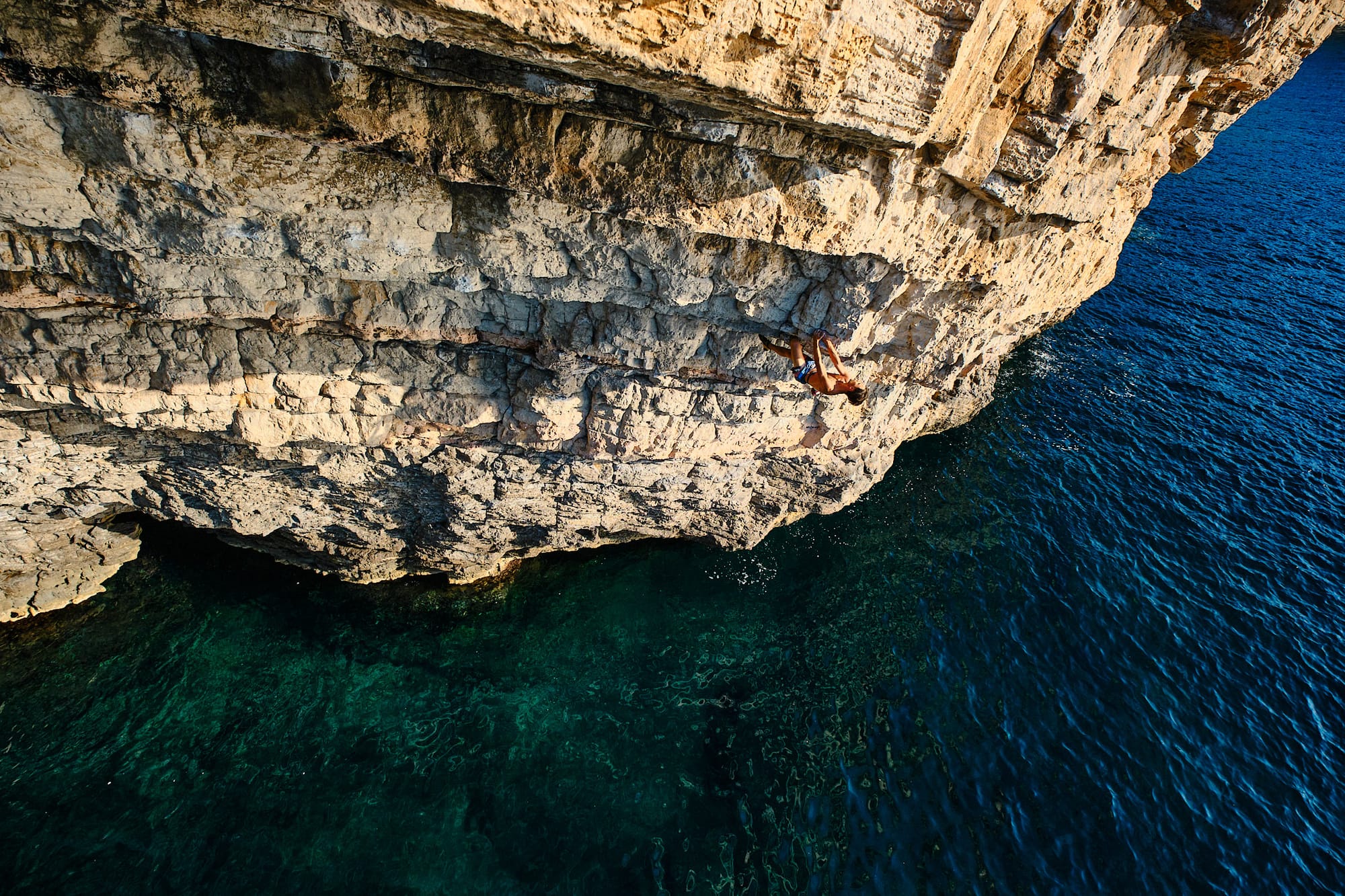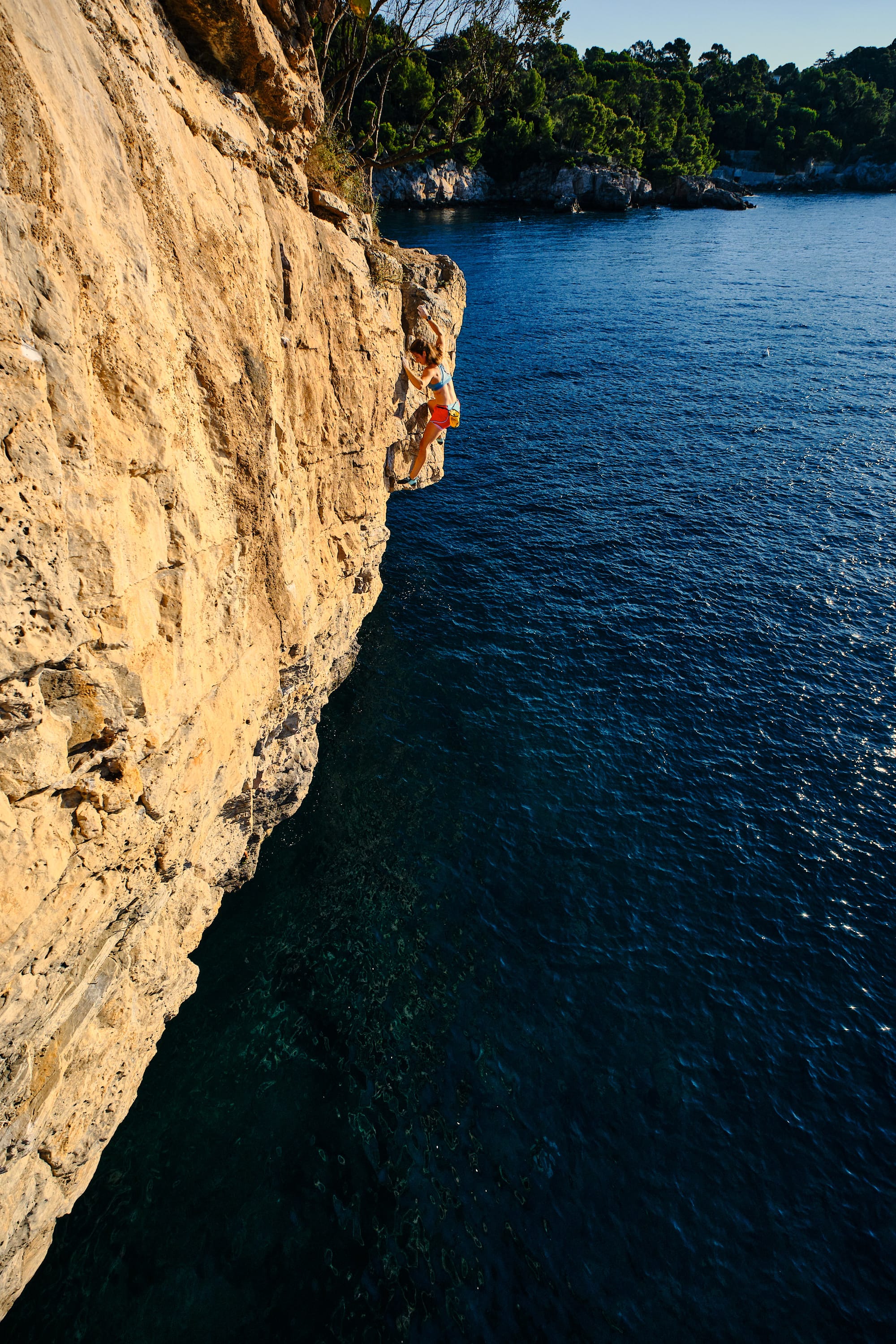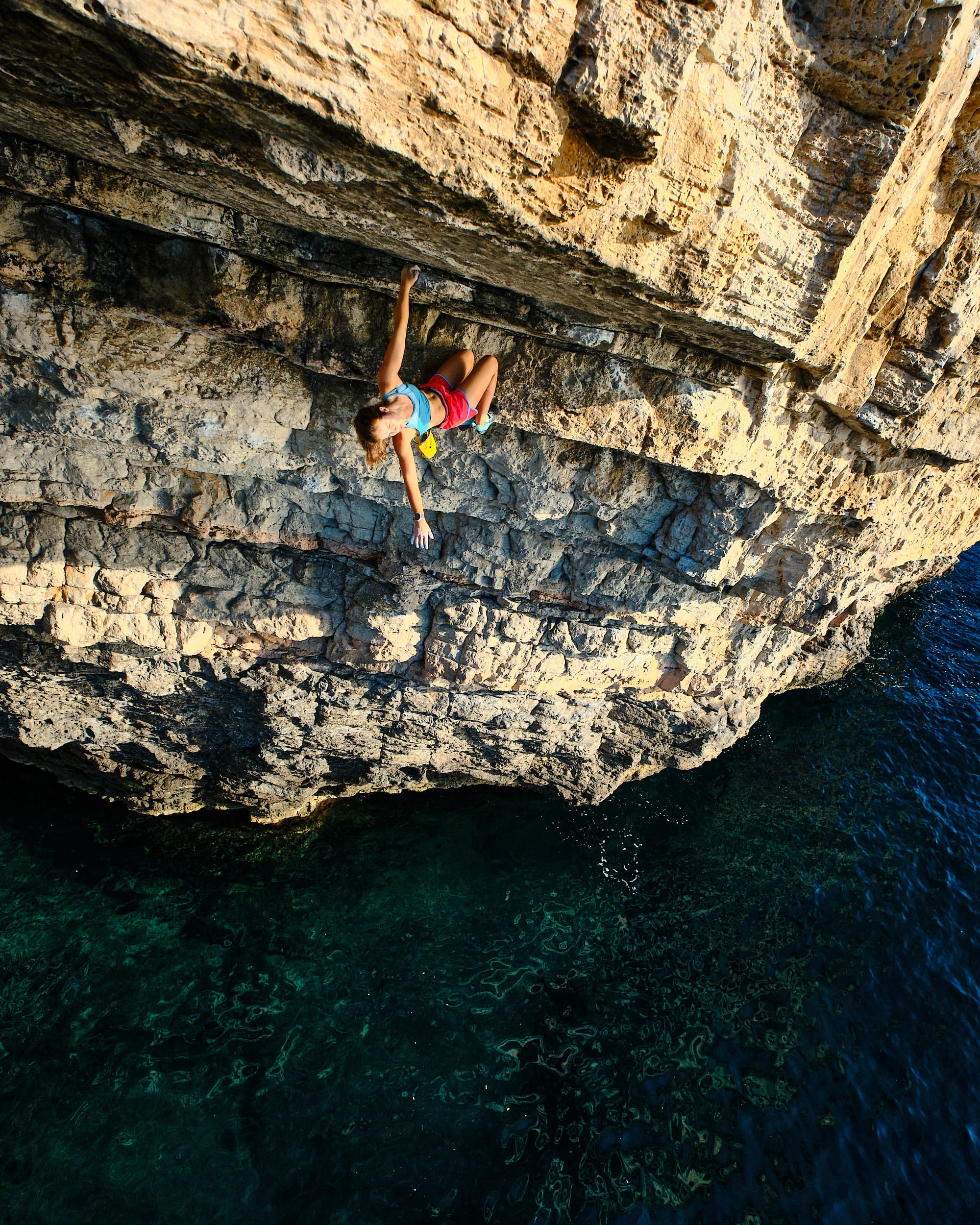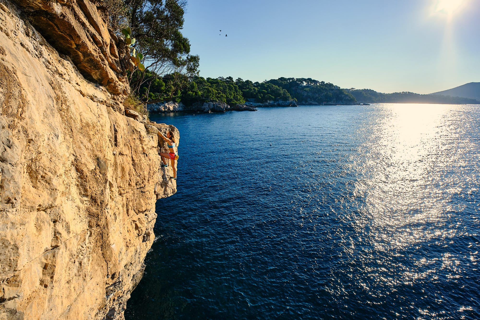 C'est la troisième journée que je passe à San Peyre : après deux autres projets vidéos avec Laura, ce matin-là, on a décidé d'aller à la falaise juste pour faire des photos. On s'est levé tôt pour bénéficier des bonnes lumières du lever du soleil qui se réveille doucement de l'autre côté de la baie, face à la falaise. La falaise prend le soleil petit à petit et elle passe du beige à l’ocre. Le grimpeur évolue là, au-dessus de l'eau qui est magnifique, claire, limpide.