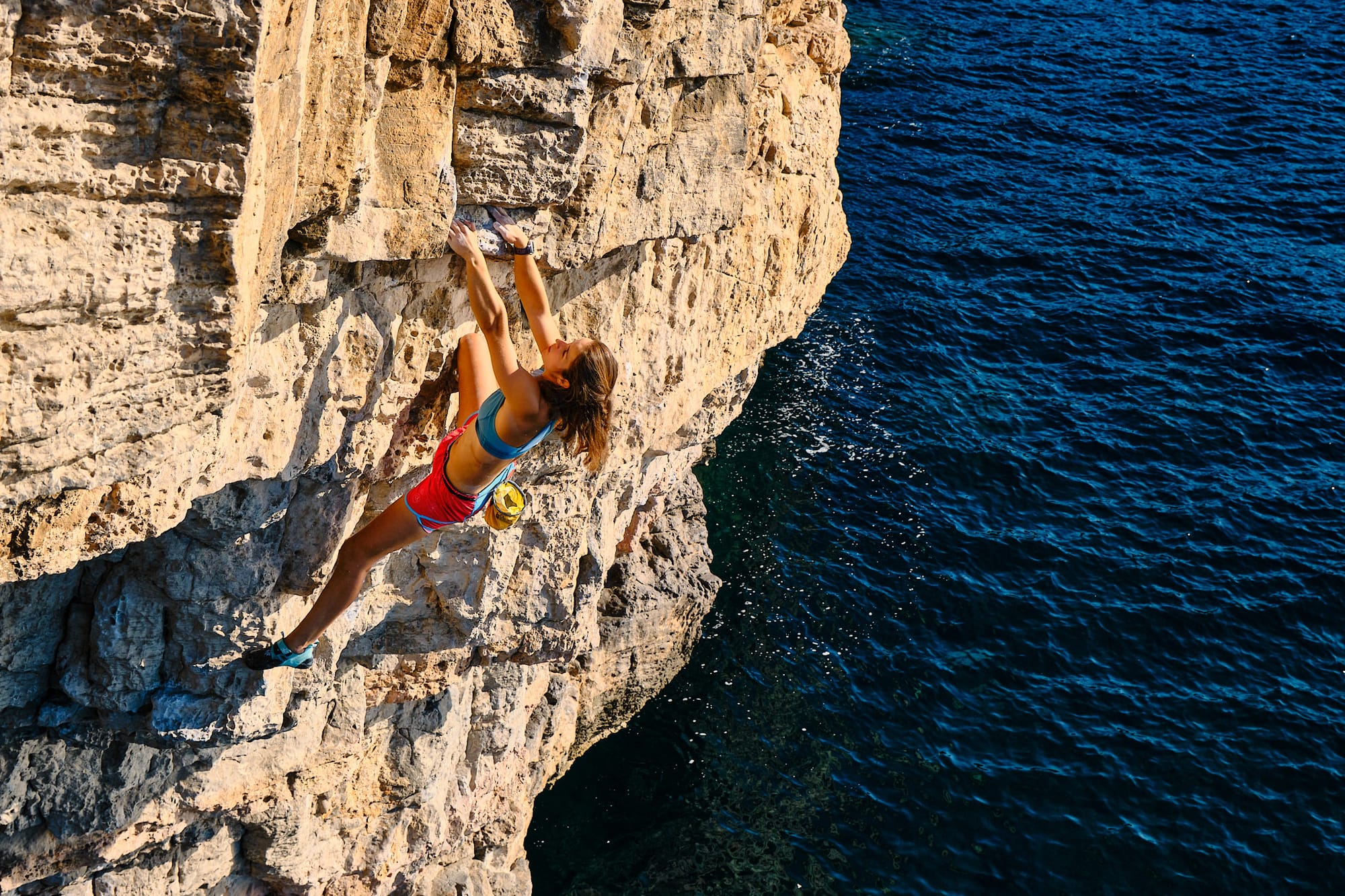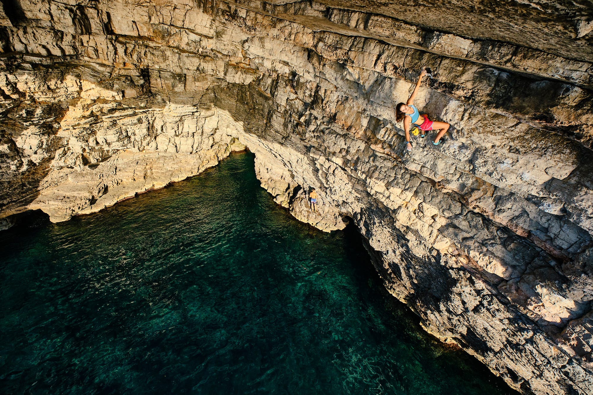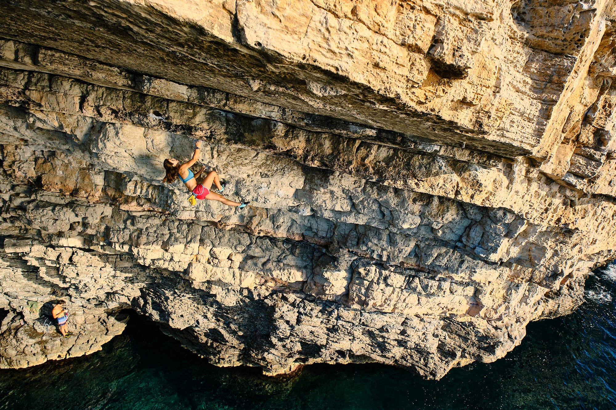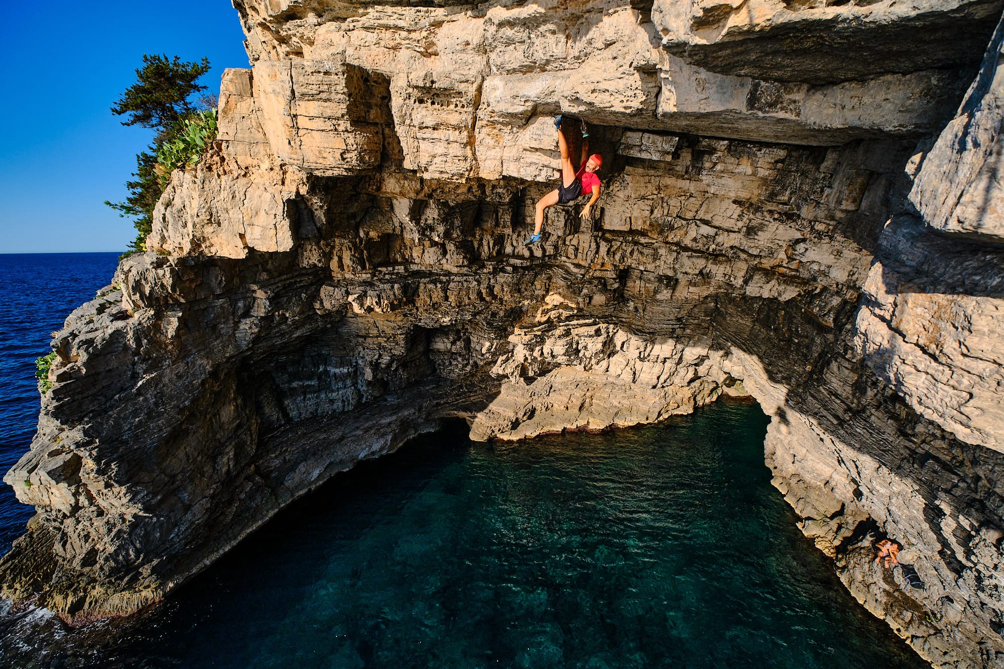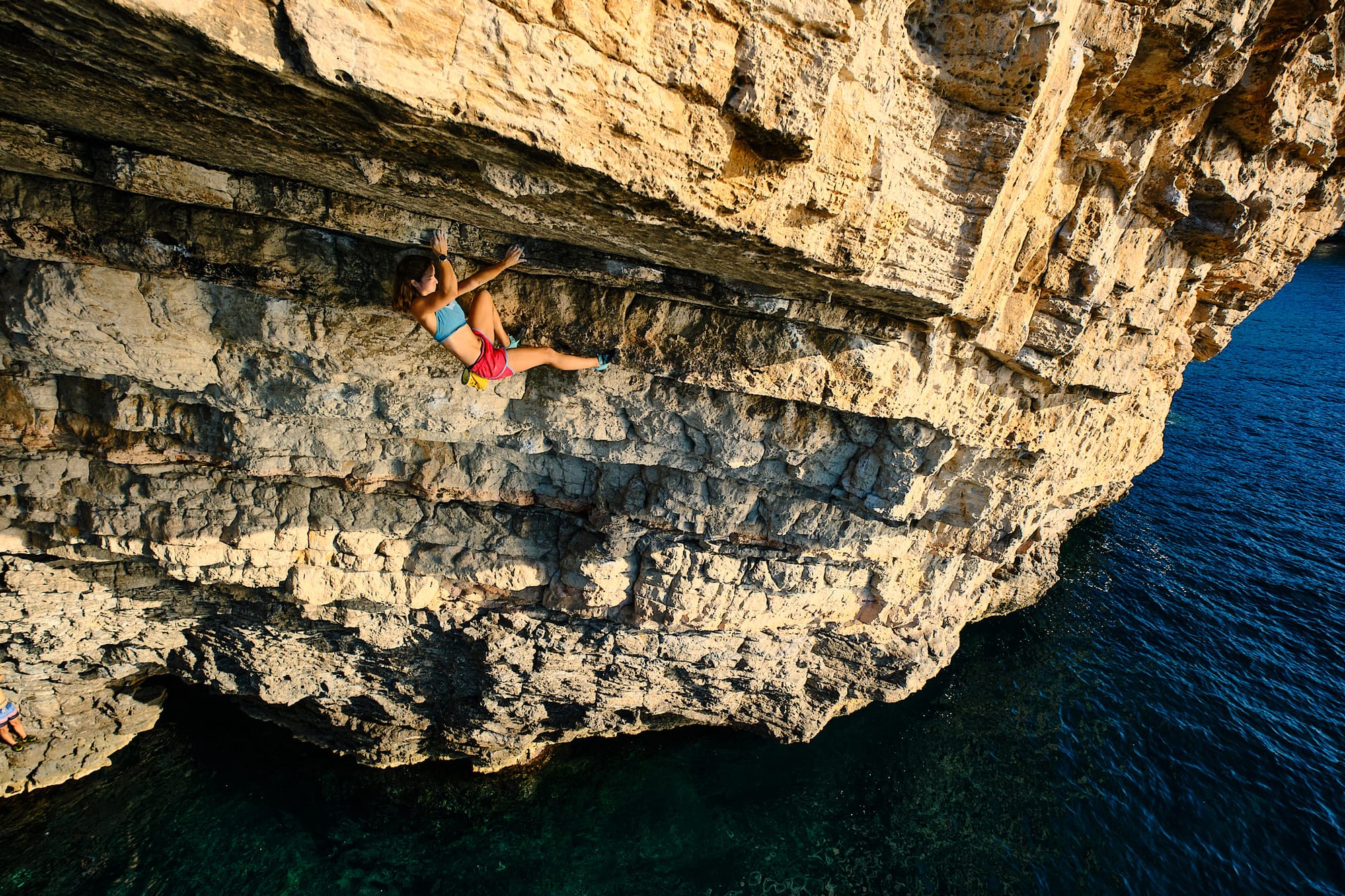 C'est la troisième journée que je passe à San Peyre : après deux autres projets vidéos avec Laura, ce matin-là, on a décidé d'aller à la falaise juste pour faire des photos. On s'est levé tôt pour bénéficier des bonnes lumières du lever du soleil qui se réveille doucement de l'autre côté de la baie, face à la falaise. La falaise prend le soleil petit à petit et elle passe du beige à l’ocre. Le grimpeur évolue là, au-dessus de l'eau qui est magnifique, claire, limpide.