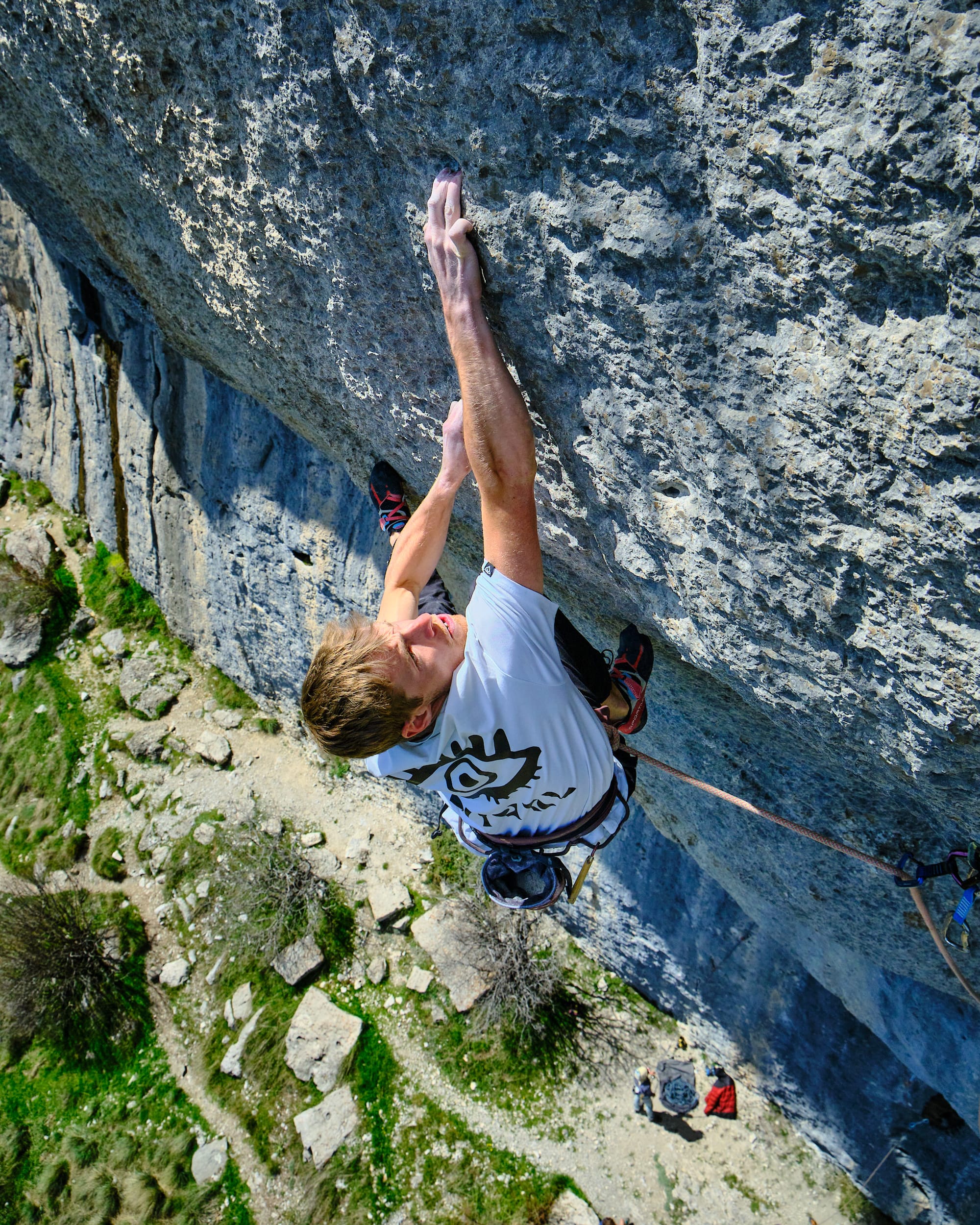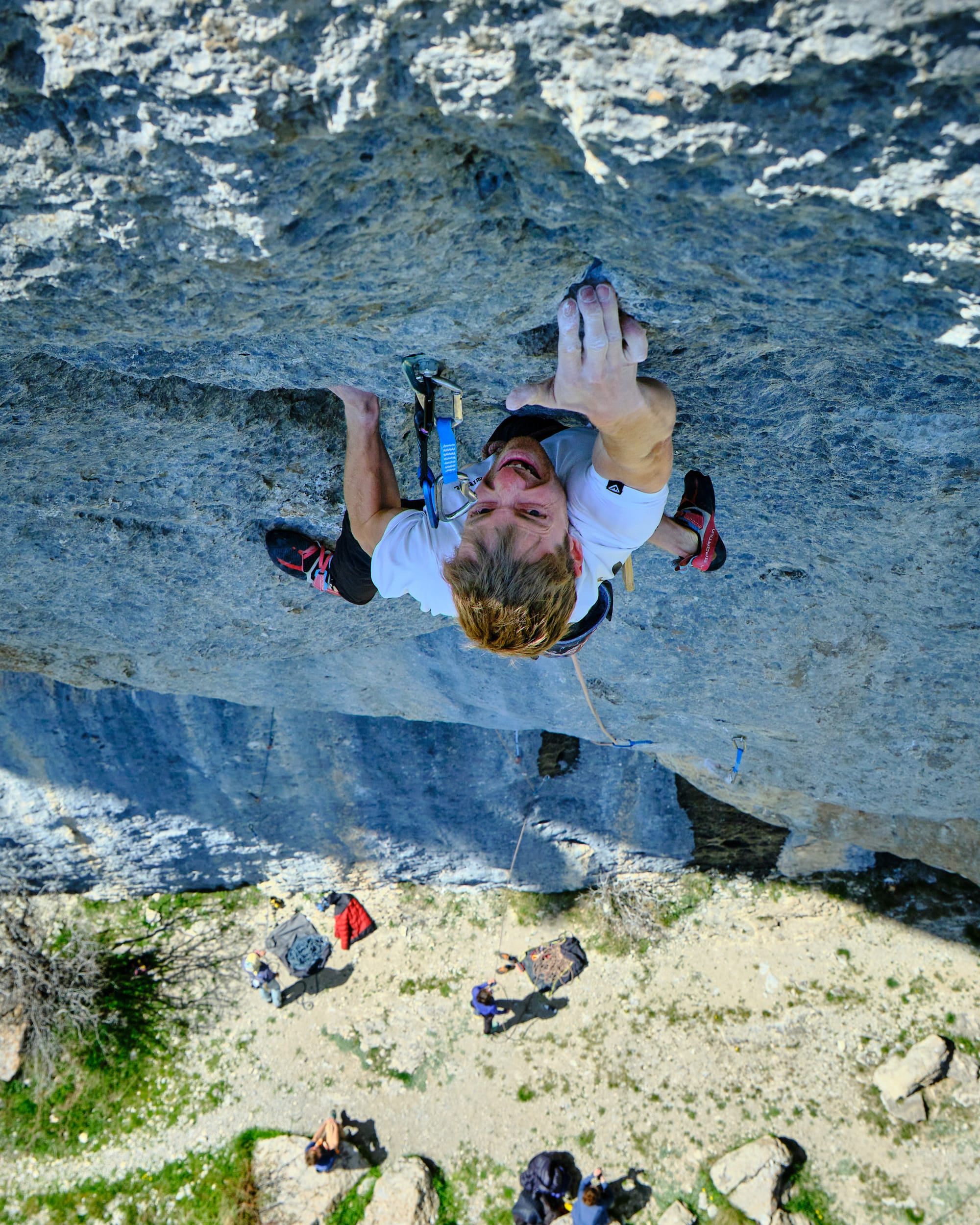 C'était la première fois que je shootais dans la voie, je ne connaissais pas les bons angles de vue, les mouvements clés, le crux... J'aime bien monter pour faire un repérage, discuter des méthodes avec le grimpeur afin de visualiser les séquences et imaginer les photos que je pourrai faire une fois suspendu à ma corde.